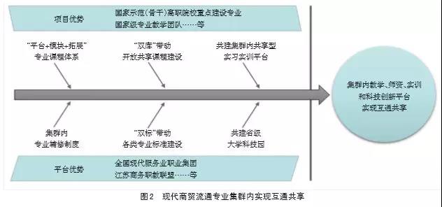 江苏经贸职业技术学院基于职业岗位群相近、行业背景和服务领域相同的原则,以电子商务、连锁经营管理2个国家示范(骨干)高职院校重点建设专业为核心,系统构建了电子商务、连锁经营管理、物流管理、移动商务、国际贸易、物联网应用、市场营销等专业协同发展的现代商贸流通专业集群。