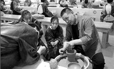 国家非物质文化遗产传承人、中国汝瓷烧制技艺传承人范随州(右)带领中职班主任们烧制汝瓷。