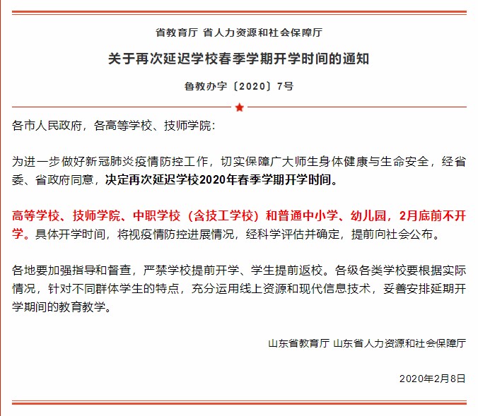 山东再发通知:技师学院、中职学校(含技工学校)2月底前不开学