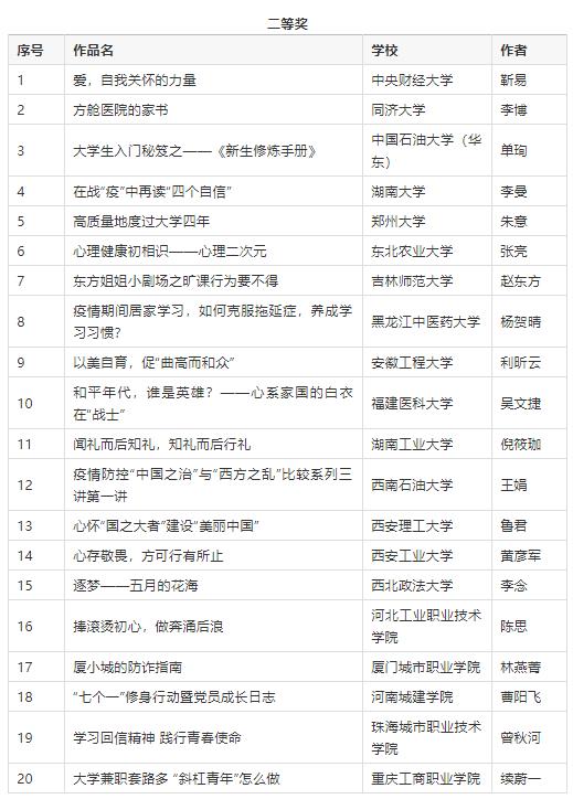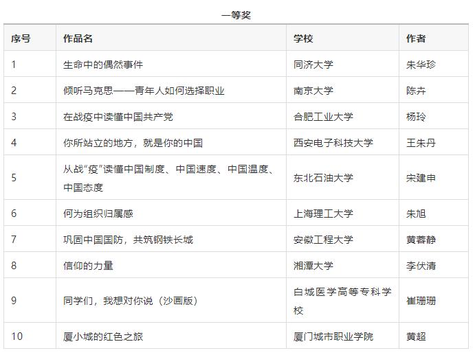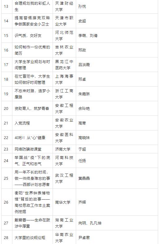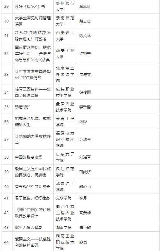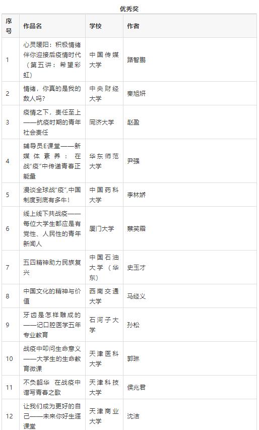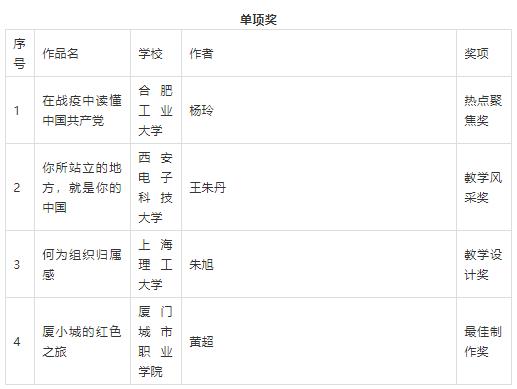 在教育部思政司精心指导和全国高校积极参与下,由高校思想政治工作队伍培训研修中心(高等教育出版社)、全国高校思想政治工作网、高校辅导员网络培训中心联合举办的2020年度全国高校思想政治工作“金微课”征集活动现已完成作品征集与专家评审,共遴选出一等奖10件、二等奖20件、三等奖30件、优秀奖50件,以及热点聚焦奖、教学设计奖、教学风采奖、最佳制作奖等单项奖各1件,现将获奖名单予以公示。