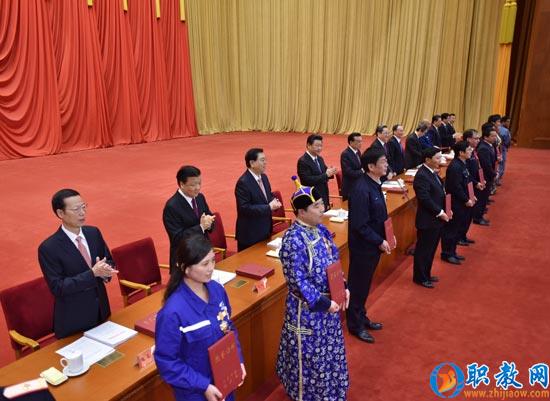 习近平等党和国家领导人向全国劳动模范和先进工作者颁发荣誉证书。新华社记者 李涛/摄