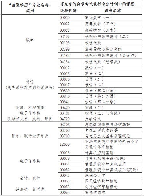 注:表格中“可免考的自学考试现行专业计划中的课程”如有新调整或变化时,按最新的专业计划执行。