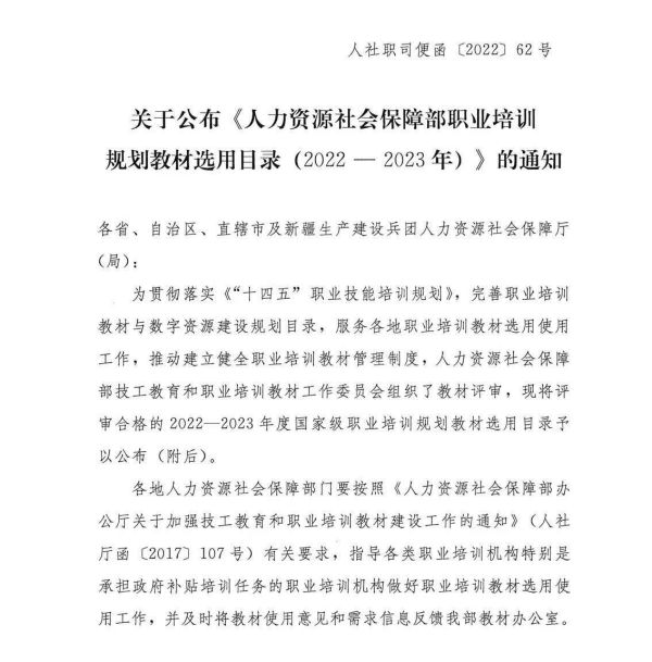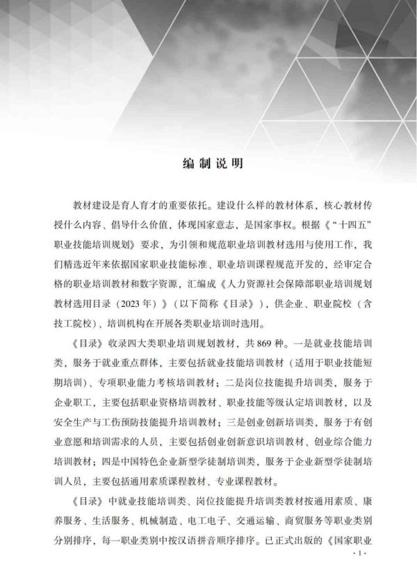 根据《“十四五”职业技能培训规划》要求, 为引领和规范职业培训教材选用与使用工作, 人力资源社会保障部技工教育和职业培训教材工作委员会办公室精选近年来依据国家职业技能标准、职业培训课程规范开发的, 经审定合格的职业培训教材和数字资源, 汇编成《人力资源社会保障部职业培训规划教材选用目录(2023 年) 》(以下简称《目录》), 供企业、职业院校(含技工院校)、培训机构在开展各类职业培训时选用。