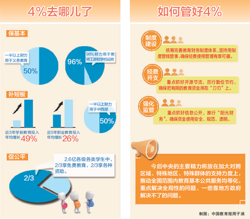 答:保基本,一“保”义务教育。从各级各类教育的分配来看,4%有一半以上财力用于义务教育,义务教育全部纳入公共财政保障范围。2006年开始,不断完善农村义务教育经费保障机制,实施了“两免一补”政策(免除学杂费、免费提供教科书、补助家庭经济困难寄宿生生活费),3次提高了生均公用经费基准定额标准;2008年实施了城市义务教育免除学杂费政策,从农村到城市,全面实现了免费义务教育;2009年全面推行了农村义务教育学校化债,4年化解900多个亿,基本解决了历史欠账问题;2011年完成“两基”国检,从东部到西部,全面普及了九年制义务教育。政府对义务教育的法定义务得到了真正落实。二“保”教师工资和学校运转。从具体支出上来看,4%接近一半财力用于教师工资,占到47%;接近一半财力用于维持学校运转和改善办学条件,占到49%。通过落实教师工资“不低于公务员平均工资水平”的法定要求,将农村教师工资全额纳入财政预算,并对义务教育学校教师率先实施绩效工资制度,1000多万名农村教师的收入水平有了可靠保障。近5年校舍建设资金所占的比重提高了6个百分点。2009年开始实施的校安工程,中央财政300亿元带动地方投入3500亿元,加固改造存在安全隐患的校舍3.5亿平方米,全面提升了中小学校抗震设防能力和综合防灾能力,全国1/4的校舍旧貌换新颜。这几年,有些地方发生了地震,但经过加固的校舍经受住了考验,没有一栋因灾倒塌,不少还成为当地群众的避难场所和安置点。