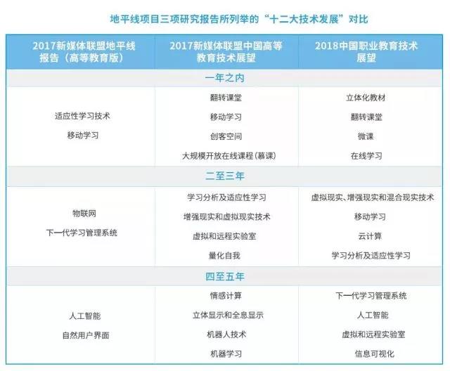 上表通过对比三份报告中排名靠前的12项重大技术,揭示了技术及其应用时间范围上的相似性和差异性。翻转课堂被视为排名第一的一年或以内将被采用的技术。人工智能、虚拟现实/增强现实、移动学习等这些新兴技术的应用也被极大肯定。