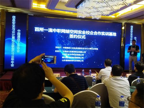 5月4日,由中国通信工业协会信息安全与云计算校企联盟联合信息安全及教育信息化上市公司立思辰康邦、网络安全实训教育服务知名企业红亚科技,职业院校互联网综合服务平台创元教育、信息安全校企合作知名企业普照教育联合投资价值3亿元教学设备及基金的“百所一流中职网络空间安全校企合作实训基地签约仪式”在武汉成功举行,首批成功入选并签约的学校共有5所。